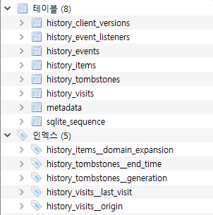 history_client_versions, history_event_listeners, history_events, history_items, history_tombstones, history_visits, metadata, sqlite_sequence 테이블이 있는데 여기서 초점을 맞춰야 하는 것 history_item 이다.