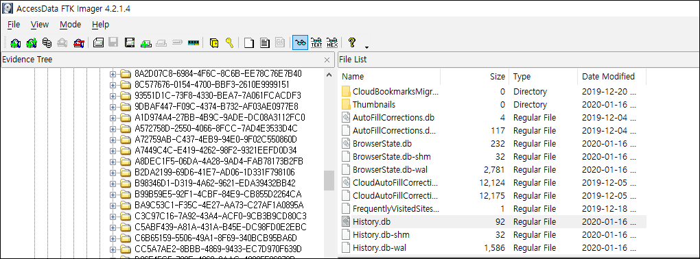 필자는 FTK imager을 통해서 History.db파일을 추출했다. 필자의 방법이 꼭 그 방향만 있는 것이 아닌, 다른 방법을 통해서 Database를 추출해도 좋다.