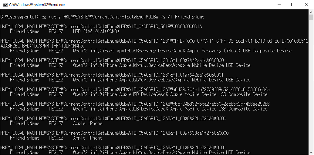 reg query HKLM\SYSTEM\CurrentControlSet\Enum\USB\