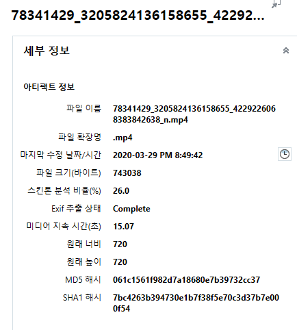 세부정보에서는 파일이름, MD5, SHA-1 해시를 확인할 수 있으며, 파일크기, 동영상의 길이를 파악할수 있습니다.