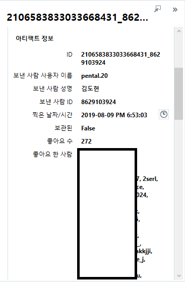 게시물을 올린사람의 이름, ID, 사용자 ID, 좋아요 수, 좋아요를 누른 사람의 아이디, 게시물을 올린시간 등을 확일할 수 있습니다.