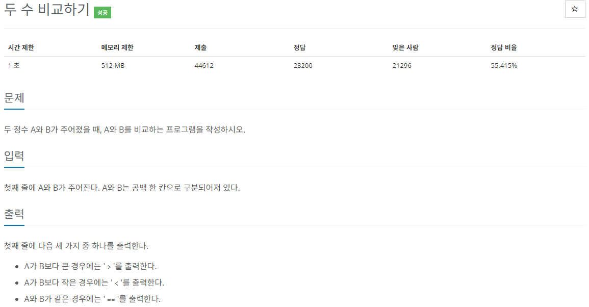 [백준] 1330 - 두 수 비교하기 (파이썬) 2020.04.02 00:19 Programming/백준 글 작성자: pental a = input() a = a.split() num1 = int(a[0]) num2 = int(a[1]) if num1 > num2: print(">") elif num1 < num2: print("<") else: print("==") 공유하기 게시글 관리 포렌식 & 개발 이야기 - Forensics & Development 저작자표시 비영리 (새창열림) 'Programming > 백준' 카테고리의 다른 글 [백준] 2884 - 알람 시계 (파이썬) (0) 2020.04.02 [백준] 14681 - 사분면 고르기 (파이썬) (0) 2020.04.02 [백준] 2753 - 윤년 (파이썬) (0) 2020.04.02 [백준] 9498 - 시험 성적 (파이썬) (0) 2020.04.02 [백준] 출력과 사칙연산 단계 (11문제) 파이썬 (0) 2020.04.02 댓글 공유하기 다른 글 댓글 이 글 공유하기 구독하기 구독하기 카카오톡 카카오톡 라인 라인 트위터 트위터 Facebook Facebook 카카오스토리 카카오스토리 밴드 밴드 네이버 블로그 네이버 블로그 Pocket Pocket Evernote Evernote 다른 글 [백준] 14681 - 사분면 고르기 (파이썬) [백준] 14681 - 사분면 고르기 (파이썬) 2020.04.02 [백준] 2753 - 윤년 (파이썬) [백준] 2753 - 윤년 (파이썬) 2020.04.02 [백준] 9498 - 시험 성적 (파이썬) [백준] 9498 - 시험 성적 (파이썬) 2020.04.02 [백준] 출력과 사칙연산 단계 (11문제) 파이썬 [백준] 출력과 사칙연산 단계 (11문제) 파이썬 2020.04.02 다른 글 더 둘러보기