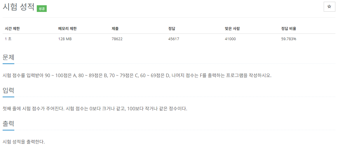 [백준] 9498 - 시험 성적 (파이썬) 2020.04.02 00:20 Programming/백준 글 작성자: pental a = int(input()) if a >= 90: print("A") elif a >= 80 and a < 90: print("B") elif a >= 70 and a < 80: print("C") elif a >= 60 and a < 70: print("D") else : print("F") 공유하기 게시글 관리 포렌식 & 개발 이야기 - Forensics & Development 저작자표시 비영리 (새창열림) 'Programming > 백준' 카테고리의 다른 글 [백준] 2884 - 알람 시계 (파이썬) (0) 2020.04.02 [백준] 14681 - 사분면 고르기 (파이썬) (0) 2020.04.02 [백준] 2753 - 윤년 (파이썬) (0) 2020.04.02 [백준] 1330 - 두 수 비교하기 (파이썬) (0) 2020.04.02 [백준] 출력과 사칙연산 단계 (11문제) 파이썬 (0) 2020.04.02 댓글 공유하기 다른 글 댓글 이 글 공유하기 구독하기 구독하기 카카오톡 카카오톡 라인 라인 트위터 트위터 Facebook Facebook 카카오스토리 카카오스토리 밴드 밴드 네이버 블로그 네이버 블로그 Pocket Pocket Evernote Evernote 다른 글 [백준] 14681 - 사분면 고르기 (파이썬) [백준] 14681 - 사분면 고르기 (파이썬) 2020.04.02 [백준] 2753 - 윤년 (파이썬) [백준] 2753 - 윤년 (파이썬) 2020.04.02 [백준] 1330 - 두 수 비교하기 (파이썬) [백준] 1330 - 두 수 비교하기 (파이썬) 2020.04.02 [백준] 출력과 사칙연산 단계 (11문제) 파이썬 [백준] 출력과 사칙연산 단계 (11문제) 파이썬 2020.04.02 다른 글 더 둘러보기