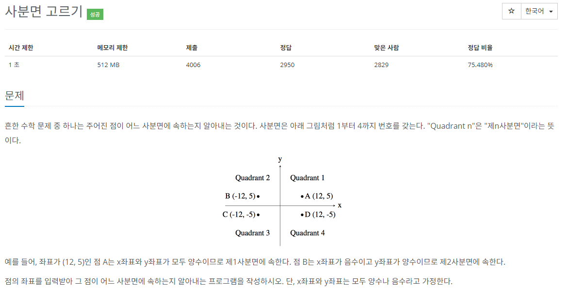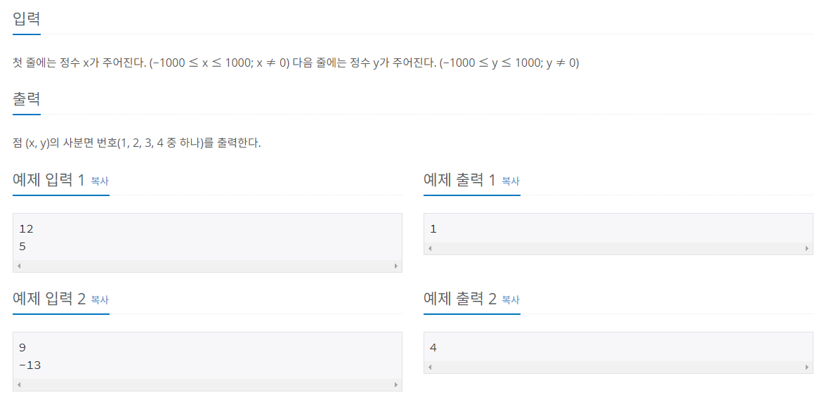 [백준] 14681 - 사분면 고르기 (파이썬) 2020.04.02 00:23 Programming/백준 글 작성자: pental a = int(input()) b = int(input()) if a > 0 and b > 0: print("1") elif a < 0 and b > 0: print("2") elif a < 0 and b < 0: print("3") else : print("4") 공유하기 게시글 관리 포렌식 & 개발 이야기 - Forensics & Development 저작자표시 비영리 (새창열림) 'Programming > 백준' 카테고리의 다른 글 [백준] 2739 - 구구단 (파이썬) (0) 2020.04.02 [백준] 2884 - 알람 시계 (파이썬) (0) 2020.04.02 [백준] 2753 - 윤년 (파이썬) (0) 2020.04.02 [백준] 9498 - 시험 성적 (파이썬) (0) 2020.04.02 [백준] 1330 - 두 수 비교하기 (파이썬) (0) 2020.04.02 댓글 공유하기 다른 글 댓글 이 글 공유하기 구독하기 구독하기 카카오톡 카카오톡 라인 라인 트위터 트위터 Facebook Facebook 카카오스토리 카카오스토리 밴드 밴드 네이버 블로그 네이버 블로그 Pocket Pocket Evernote Evernote 다른 글 [백준] 2739 - 구구단 (파이썬) [백준] 2739 - 구구단 (파이썬) 2020.04.02 [백준] 2884 - 알람 시계 (파이썬) [백준] 2884 - 알람 시계 (파이썬) 2020.04.02 [백준] 2753 - 윤년 (파이썬) [백준] 2753 - 윤년 (파이썬) 2020.04.02 [백준] 9498 - 시험 성적 (파이썬) [백준] 9498 - 시험 성적 (파이썬) 2020.04.02 다른 글 더 둘러보기