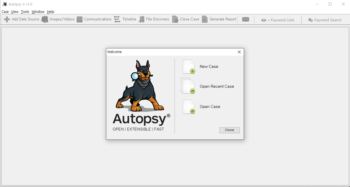 Autopsy를 설치하고 처음 실행을 하면, 불독? 하마리가 저를 반겨줍니다!