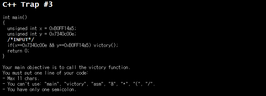 - You can't use: "main", "victory", "asm", "&", "*", "(", "/". (위 구문들을 사용할 수 없다.)