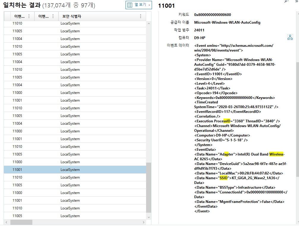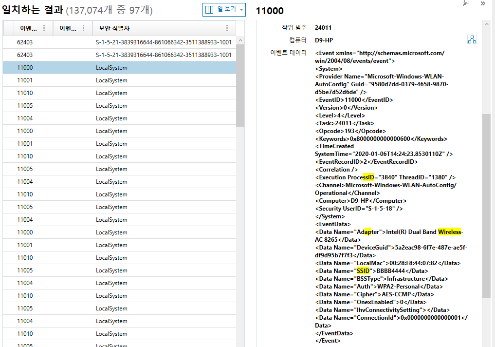 총 97개의 이벤트 로그가 확인이 되었다.