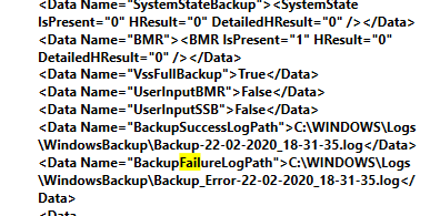 <Data Name="BackupSuccessLogPath">C:\WINDOWS\Logs\WindowsBackup\Backup-22-02-2020_18-31-35.log</Data> <Data Name="BackupFailureLogPath">C:\WINDOWS\Logs\WindowsBackup\Backup_Error-22-02-2020_18-31-35.log</Data>