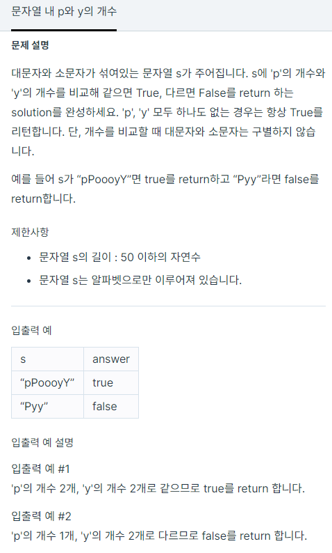 [프로그래머스] 문자열 내 p와 y의 개수 2020.10.09 00:21 Programming/프로그래머스 글 작성자: pental Question def solution(s): p = s.count('p') P = s.count('P') P_num = p + P y = s.count('y') Y = s.count('Y') Y_num = y + Y if P_num == Y_num : return True else : return False count 함수를 통해 p와 P, y와 Y의 개수를 찾고, 조건식을 이용해 결과값을 반환한다. 공유하기 게시글 관리 포렌식 & 개발 이야기 - Forensics & Development 저작자표시 비영리 (새창열림) 'Programming > 프로그래머스' 카테고리의 다른 글 [프로그래머스] 핸드폰 번호 가리기 (0) 2020.10.09 [프로그래머스] 나누어 떨어지는 숫자 배열 (0) 2020.10.09 [프로그래머스] 2016년 (0) 2020.10.07 [프로그래머스] 문자열 다루기 기본 (0) 2020.10.06 [프로그래머스] 두 정수 사이의 합 (0) 2020.10.06 댓글 공유하기 다른 글 댓글 이 글 공유하기 구독하기 구독하기 카카오톡 카카오톡 라인 라인 트위터 트위터 Facebook Facebook 카카오스토리 카카오스토리 밴드 밴드 네이버 블로그 네이버 블로그 Pocket Pocket Evernote Evernote 다른 글 [프로그래머스] 핸드폰 번호 가리기 [프로그래머스] 핸드폰 번호 가리기 2020.10.09 [프로그래머스] 나누어 떨어지는 숫자 배열 [프로그래머스] 나누어 떨어지는 숫자 배열 2020.10.09 [프로그래머스] 2016년 [프로그래머스] 2016년 2020.10.07 [프로그래머스] 문자열 다루기 기본 [프로그래머스] 문자열 다루기 기본 2020.10.06 다른 글 더 둘러보기
