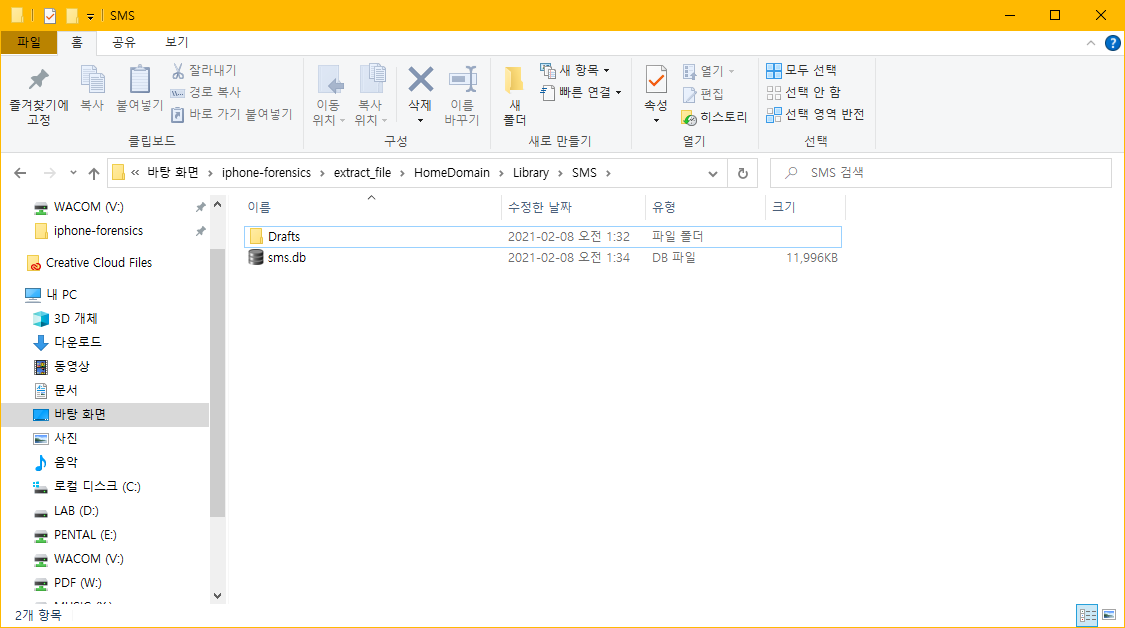 이중에서도 sms.db 파일을 사용할 예정입니다. 먼저 DB Browser for SQLite 프로그램을 사용해 확인해 보도록 하겠습니다.