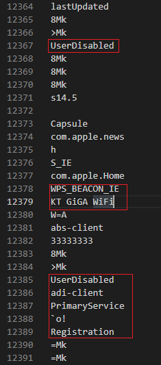 위 사진과 같이 아이폰 기종, 버전이 나온후 com.apple.AppleAccount와 com.apple.AuthKit 이라는 값이 존재한다. 해당 키워드와 iPhone이라는 키워드를 통해서 문제에서 주어진 메모리 파일에서 똑같이 적용하여 검색을 한다.