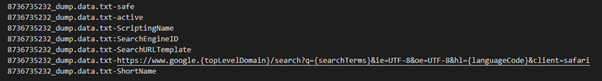 SearchEngine을 검색엔진으로 추정한 이유는, 직접 제작한 메모리 파일 [그림 20]을 통해 SerachEngine, 즉 검색엔진의 형태를 파악했다. 검색엔진의 형태는 [그림 19]과 같이 “SearchEngineID”와 “SearchURLTemplate”의 형태를 띄고 있다. 또한 “{searchTerms}”과 같이 인자 값을 넣어주는 URL들을 파악 할 수 있으며, 검색엔진의 URL들은 우선순위에 두지 않고 분석을 진행했다.
