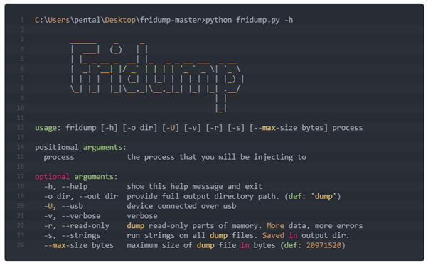 Fridump usage와 optional arguments는 위 사진과 같다. 아이폰 메모리를 추출하기 위해서는 다음과 같은 커맨드라인을 사용한다.