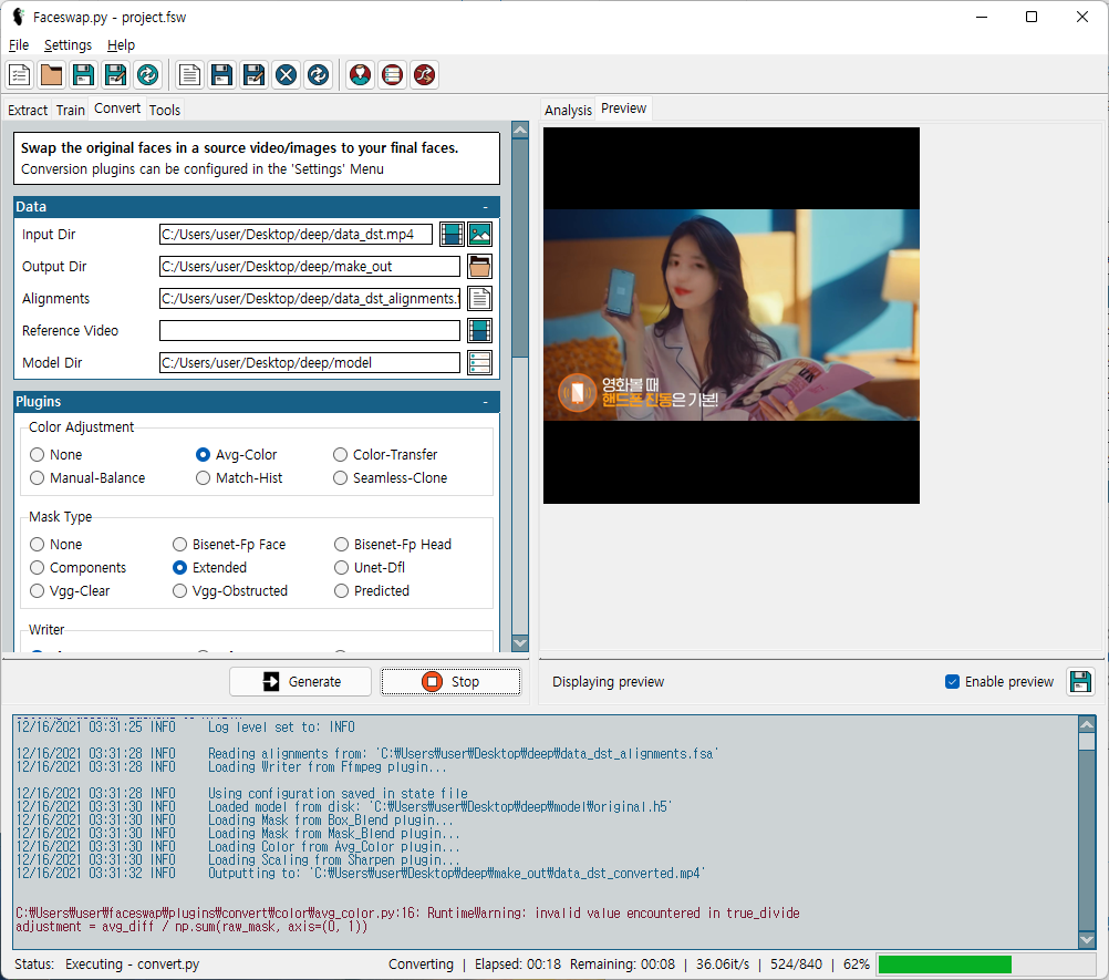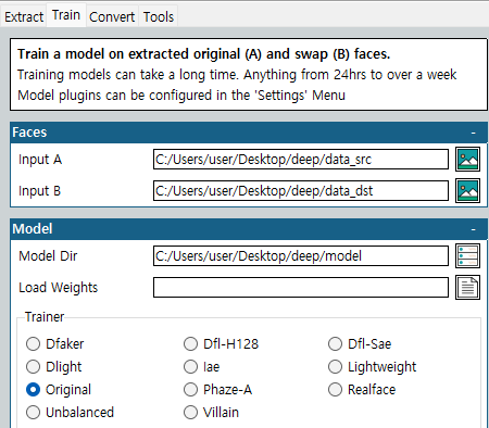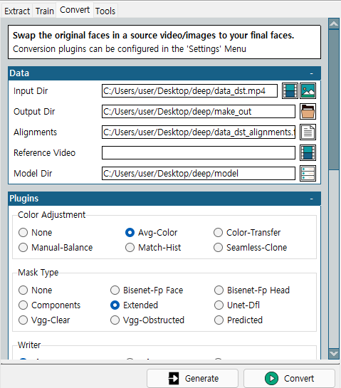 Extract의 경우 얼굴 데이터 셋의 추출, Train은 얼굴 학습, Convert는 동영상에 얼굴 Swap 기능을 담당하고 있습니다.