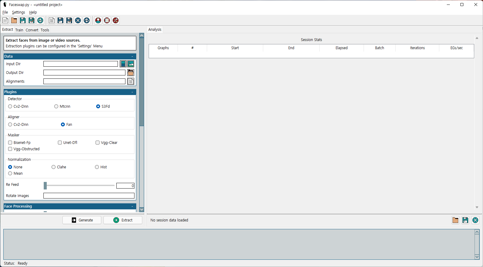 Input Dir 에는 대상 동영상을 탑재, Output Dir 에는 데이터가 담길 폴더를 지정합니다. 그후 Detector에서는 Cv2-Dnn, Aligner에서도 Cv2-Dnn 을 선택합니다. 따로 설명은 하지 않겠습니다. 경로 설정을 완료 했다면, Extract 버튼을 눌러 추출을 진행합니다.