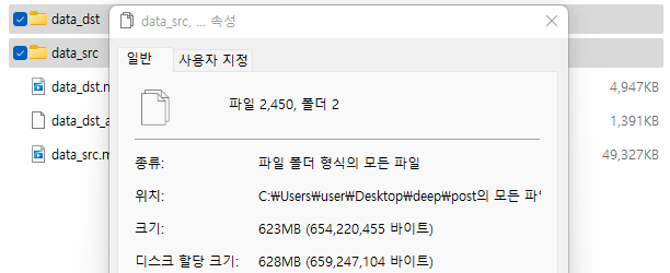 data_dst와 data_src 폴더에는 총 2450파일이 존재하는것을 확인했고, 얼굴이 인식되지 않았거나, 다른 얼굴이 인식된 경우를 삭제해줘야 하기에, 사진 분류 작업을 진행합니다.