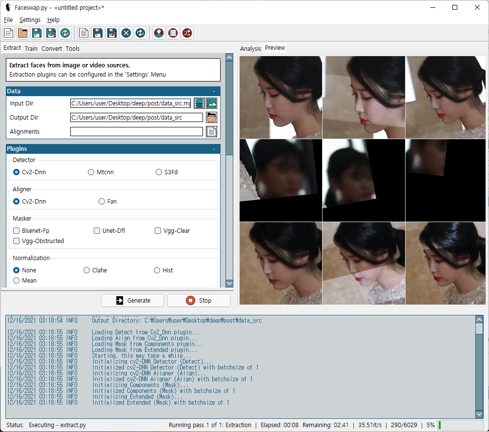 Extract 버튼을 누르게 되면, Preview에서 얼굴이 추출되는 것을 확인 할 수 있고, 우측 하단에 남은 게이지를 확인 할 수있습니다.