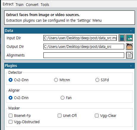 Extract의 경우 얼굴 데이터 셋의 추출, Train은 얼굴 학습, Convert는 동영상에 얼굴 Swap 기능을 담당하고 있습니다.