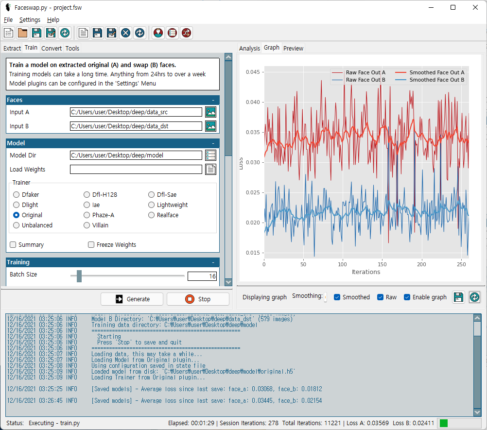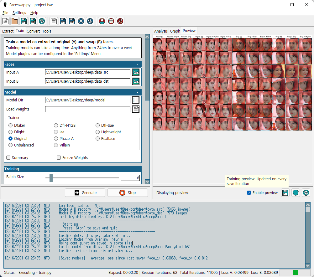 Input A에는 합성 할 대상 얼굴 데이터 폴더 , Input B에는 합성을 시킬 얼굴 데이터 폴더를 각각 지정해주고, Model Dir에는 합성 데이터가 들어갈 경로를 지정해줍니다. 그후 Train 버튼을 누르면 학습이 진행됩니다.
