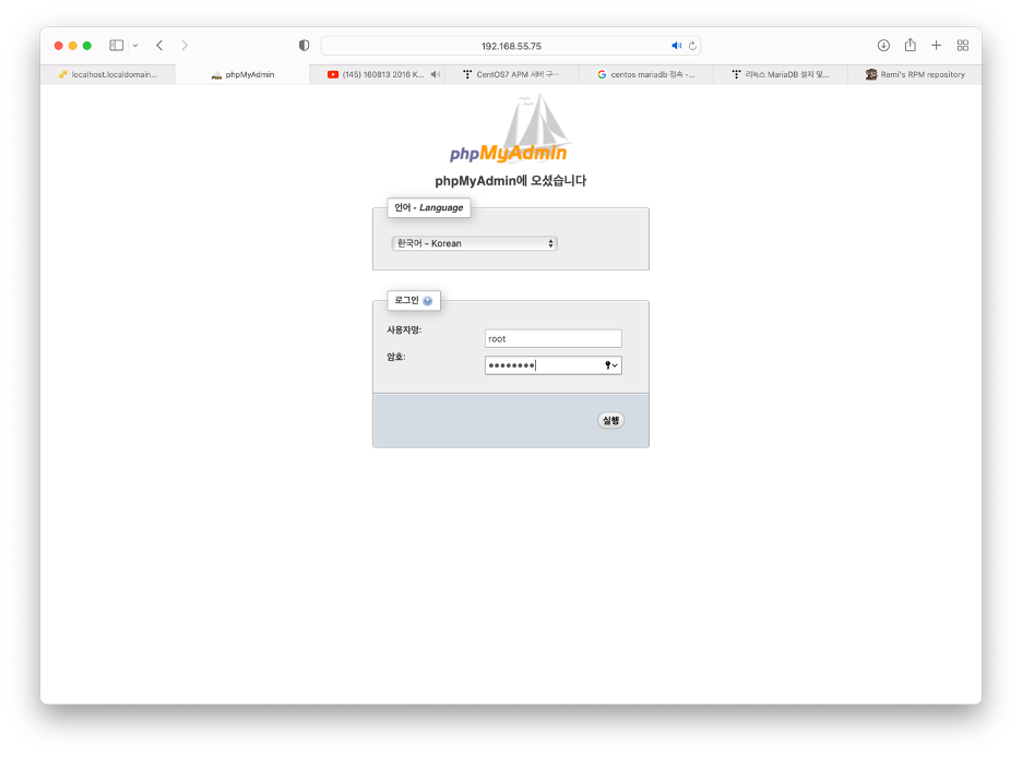 다시 phpmyadmin을 접속해, 설정한 비밀번호로 들어간다.