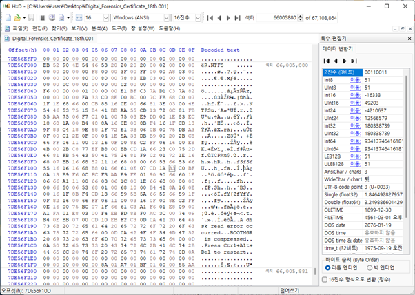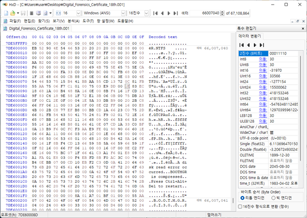 FTK Imager을 통해서 E01 파일을 Raw 형태로 변경 후, HxD 프로그램을 통해서 해당 시작섹터와 끝 섹터를 확인한다. 파티션 4번의 시작 섹터인 66,007,040 섹터를 가서 확인한다.