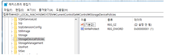 HKLM\SYSTEM\CurrentControlSet\Control\StorageDevicePolicies 에서 WriteProtect의 값을 1로 변경하고 재부팅 또는 USB를 다시 연결하면 논리적 쓰기 방지 설정이 가능하다. 논리적 쓰기 금지 설정을 마친후 다음과 같은 작업을 진행한다.