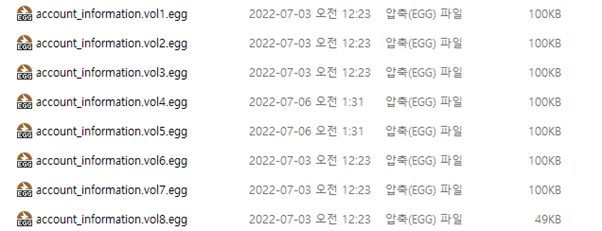 중요 폴더에서는 egg 파일 여러 개를 발견 할 수 있으며, 해당 파일은 분할 압축된 파일이다. 해당 파일에서는 4번과 5번이 사라진 것을 확인 할 수 있으며, 해당 파일을 추출후 분석한다.