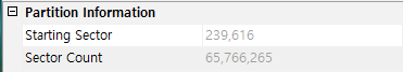 현재 [그림 6] 을 통해서 파티션 3번의 시작 섹터는 239,616 으로 확인 할 수 있었으며, 파티션 4번 66,007,040 을 통해 파티션 3의 총 섹터는 239,616 ~ 66,007,039 으로 확인 할 수 있다.