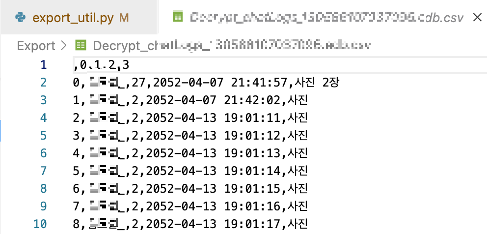 그후 ChatLog_*.EDB 파일을 돌면서 authorID, 즉 UserID의 값이다. 이 값을 딕셔너리 키값과 동일하면 이름을 변경하고 CSV 파일로 저장한다.