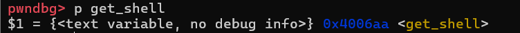 gdb 에서 p get_shell 을 하면 get_shell의 주소를 확인 할수 있으며 여기서는 0x4006aa 를 나타내고 있다.