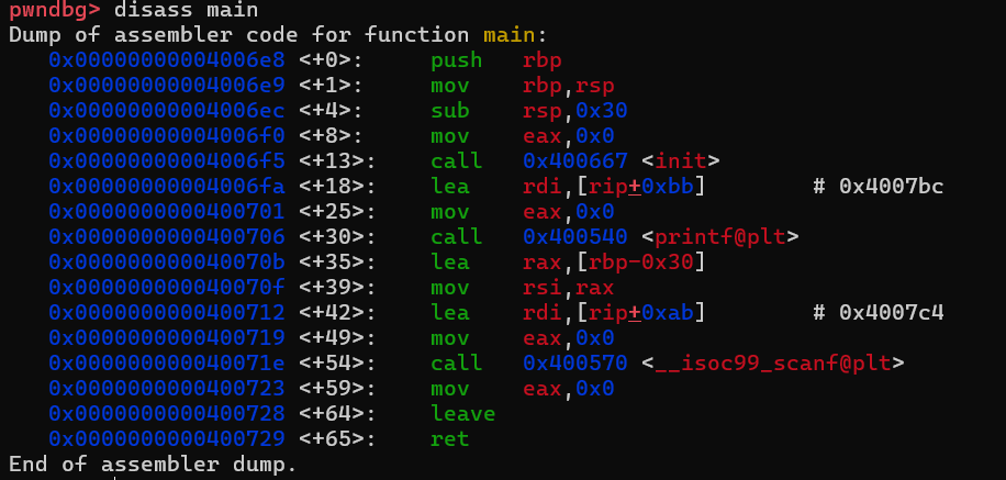 main 함수의 어셈블리를 확인해보면 main+4에서 rsp에 0x30 을 통해서 buffer를 설정한다.