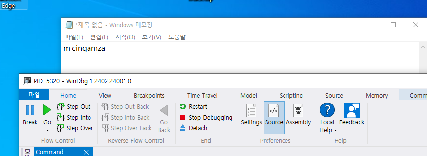 이제 Guest환경에서 Windbg를 실행시켜 메모장의 메모리를 확인 해 본다.