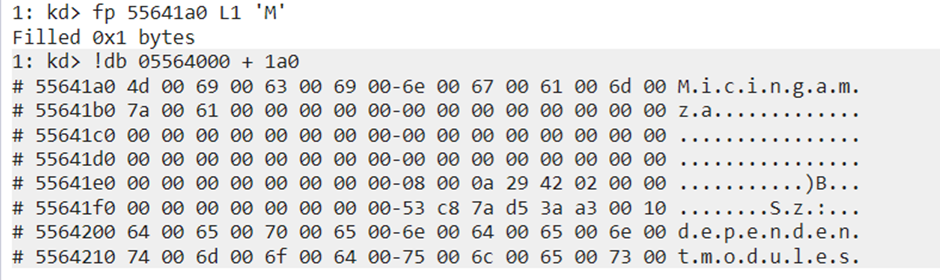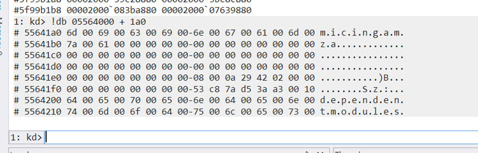 마지막에서는 !db 를 통해서 해당 영역만큼 읽으면 된다. 그럼 아까 메모장에 적은 micingamza 가 나타나는 것을 확인 할 수 있다.