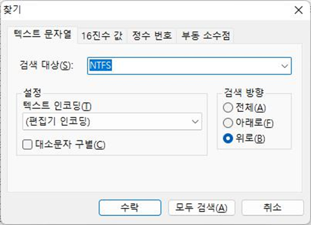 이 경우 파티션 4번의 시작 섹터에서 검색함으로 검색 방향을 “위로”로 지정해 주고 탐색을 진행 해야한다.