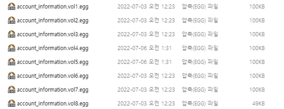 분할 압축에서는 일부 egg 파일이 사라져도 1번파일에는 해당 압축에 어떠한 파일이 있는지 확 인 할 수 있다. 해당 압축파일에는 account bank.xlsx 파일을 확인 할 수 있다.