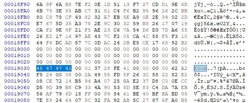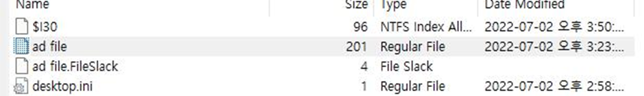 해당 파일은 각각 100kb 로 분할된 것을 이루어, 은닉된 파일은 100~200kb 로 가정하고 확인하 면 발견 할 수 있다. 해당 파일의 시그니처가 다른 egg 파일과 동일하게, EGGA 임을 확인 할 수 있다. 해당 ad file 에는 2개의 파일로 은닉된 것을 확인 할 수 있다.