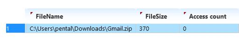 인터넷 브라우저 분석중 다운로드 기록을 확인하면 총 1개의 파일 다운로드 흔적을 발견할 수 있 으며, 경로는 C:\Users\pental\Downloads\Gmail.zip 으로 확인 할 수 있다.