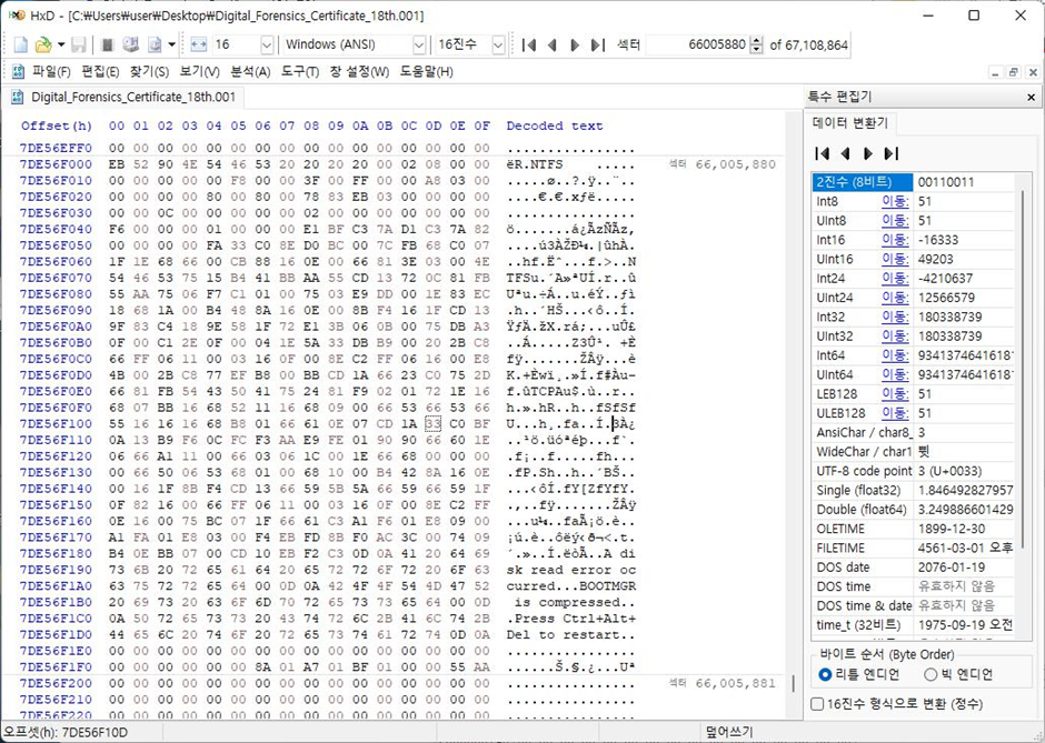 FTK Imager을 통해서 E01 파일을 Raw 형태로 변경 후, HxD 프로그램을 통해서 해당 시작섹터와 끝 섹터를 확인한다. 파티션 4번의 시작 섹터인 66,007,040 섹터를 가서 확인한다.