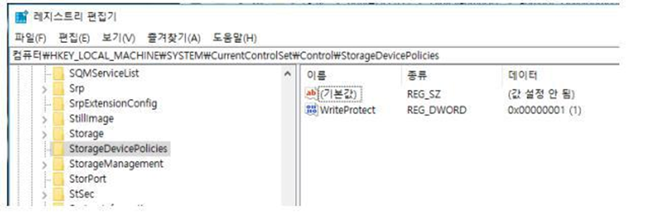 HKLM\SYSTEM\CurrentControlSet\Control\StorageDevicePolicies 에서 WriteProtect의 값을 1로 변경하고 재부팅 또는 USB를 다시 연결하면 논리적 쓰기 방지 설정이 가능하다 논리적 쓰기 금지 설정을 마친후 다음과 같은 작업을 진행한다.