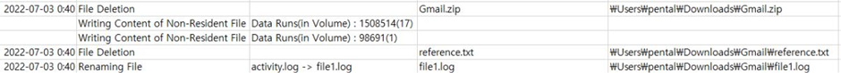 압축해제는 2022-07-03 00:34 에 압축해제가 된 것을 로그를 통해서 확인 할 수 있었고, File Deletion File과 Renaming File을 통해서 압축파일에서는 reference.txt 파일과 activity.log 파일이 존재하는 것을 확인 할 수 있다.