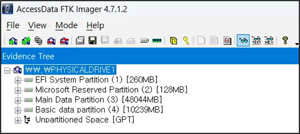 [그림 3]은 압수한 저장매체를 물리드라이브로 연결 후 확인된 파티션 목록이다. 확인된 파티션은 총 4개이다. 파티션 확인 후 전체 이미징 작업을 진행한다.