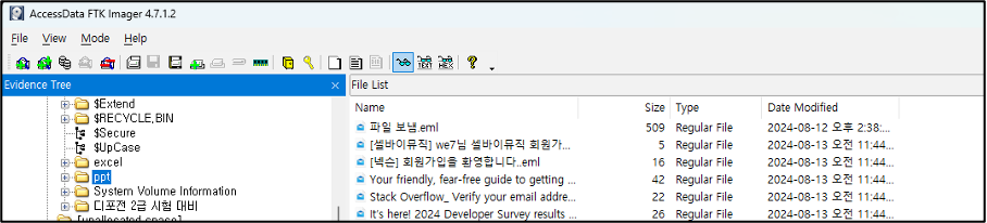 그림 22 FTK Imager을 이용한 ppt 폴더 내 eml 파일