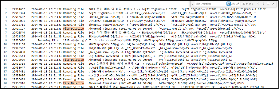 또한 2024년 8월 13일 오후 10시 1분 32초부터 2024년 8월 13일 오후 10시 2분 28초까지 excel 폴더 내 파일들에 대해 와이핑이 진행되었으며, 총 150개의 파일이 완전삭제(File Wiping)된 흔적을 발견할 수 있다.