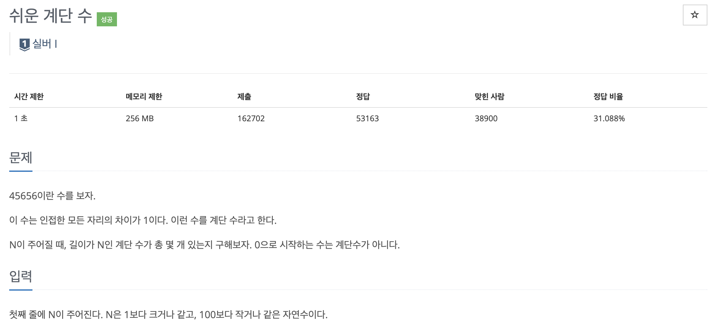 - N이 주어질 때, 깊이가 N인 계단 수의 갯수를 구하는 문제이다.