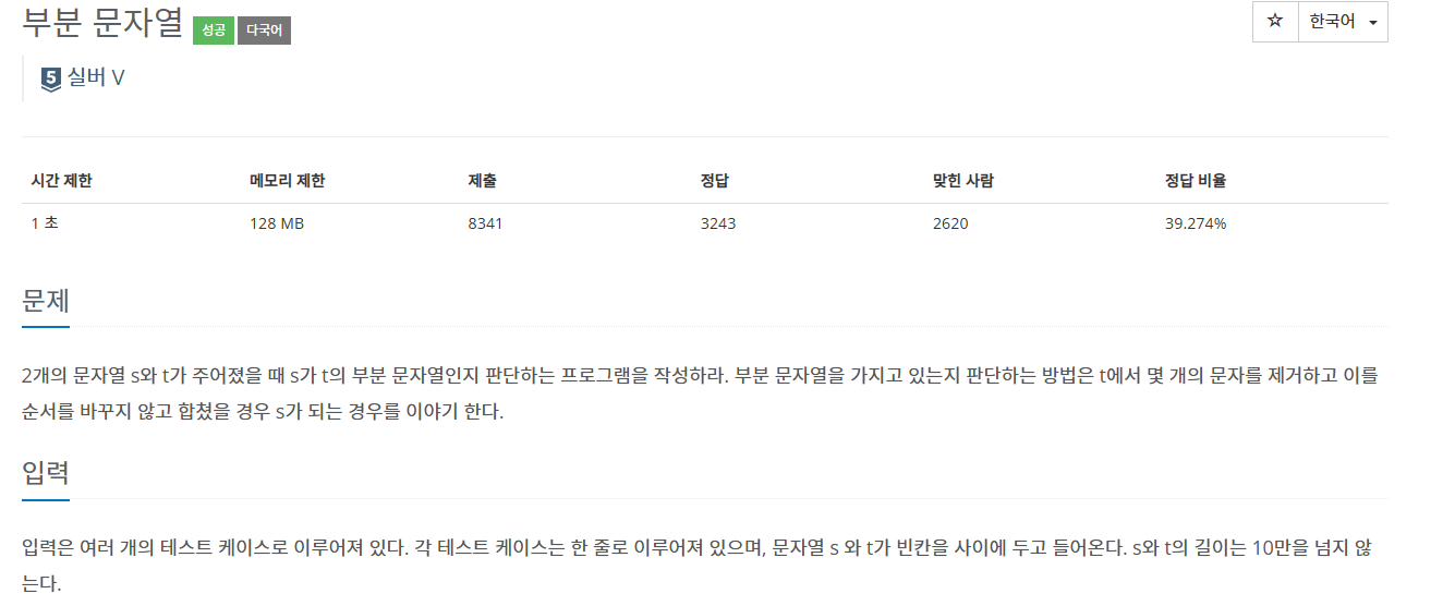 문자열 S가 문자열 T의 부분 문자열인지 판별하는 문제이다.