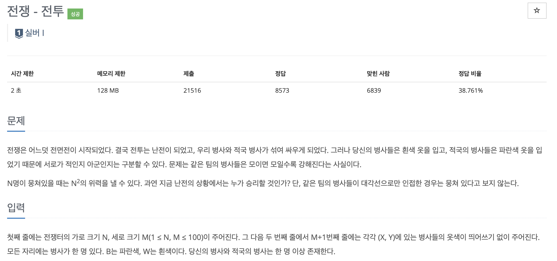 주어진 전장 지도에서 각 팀의 전투력을 계산하는 문제이며, 전투력은 같은 팀의 병사가 상하좌우로 연결된 병사들의 수의 제곱으로 계산된다.