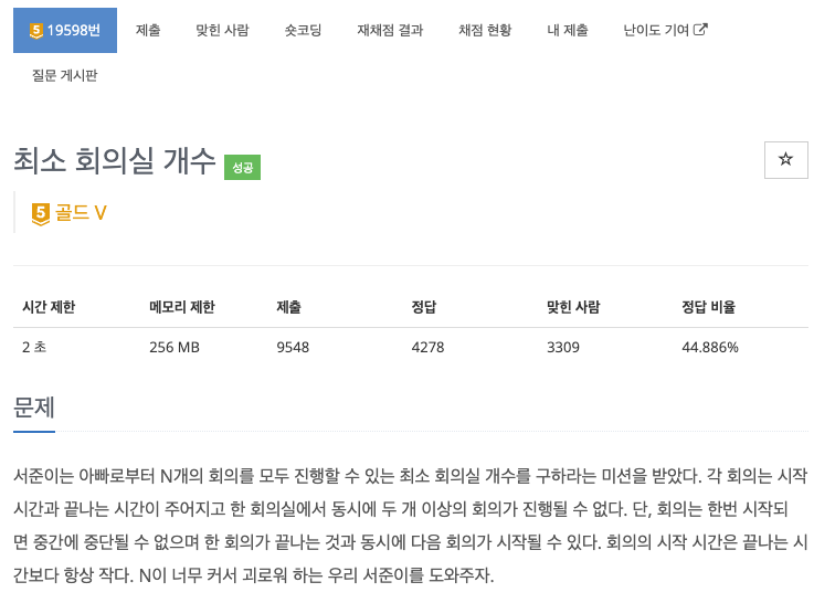 • 시작 시간을 기준으로 정렬하여, 빠른 시간에 시작하는 회의를 먼저 처리