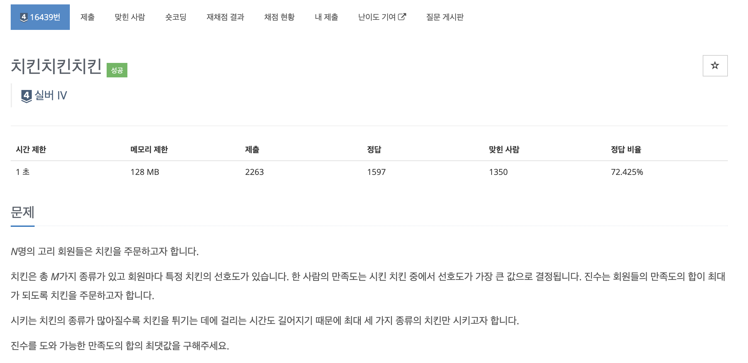 - 3가지 치킨을 선택했을 때, 사람들이 가장 좋아하는 치킨 중 최대값을 모두 합한 값이 최대가 되도록 해야 한다.