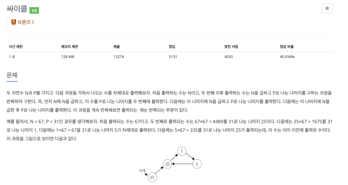 수열을 계속 계산하다 보면, 언젠가 같은 값이 다시 등장해서 반복(싸이클)이 발생한다. 이때 반복되는 구간의 길이를 구하는 문제이다.