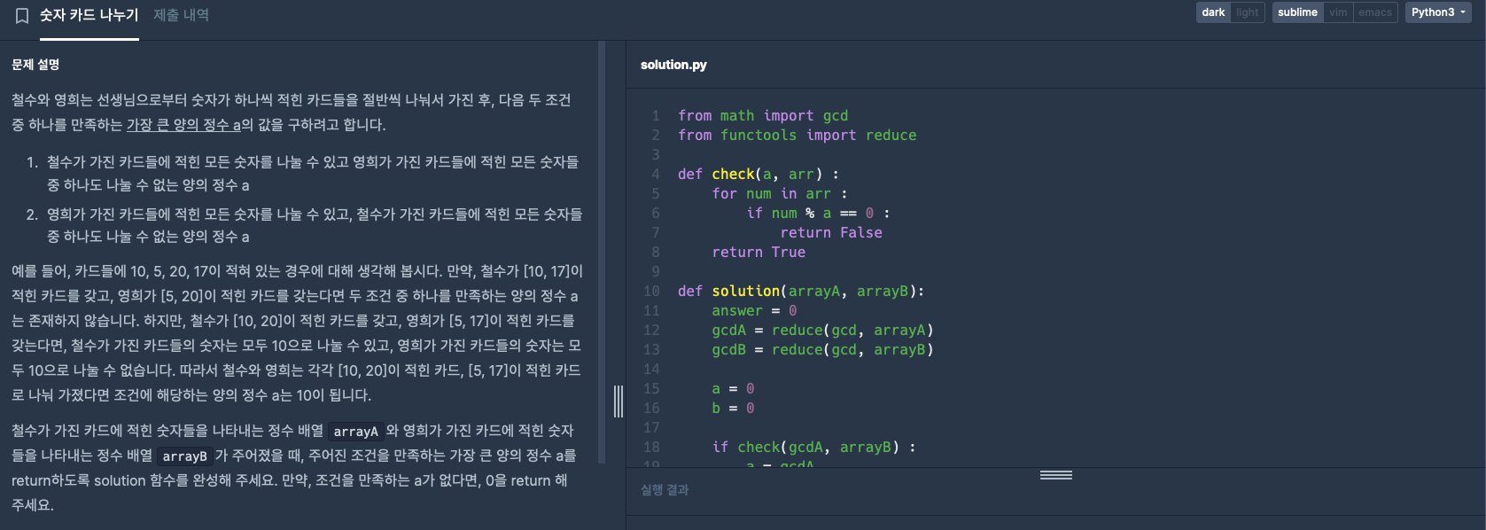 새로운 모듈을 발견해서 사용해봤다. gcd 모듈은 최대 공약수를 구할때 사용하고, reduce는 처음 써봤는데, 배열 내 모든 요소에 대해 gcd를 적용해서 전체의 최대공약수를 구하기 위해서 사용했다.